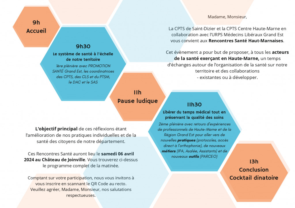 Cet événement est organisé par les CPTS de Haute-Marne (CPTS Saint Dizier Der et Blaise et CPTS du Centre Haute-Marne) avec le soutien de l’URPS ML Grand Est.